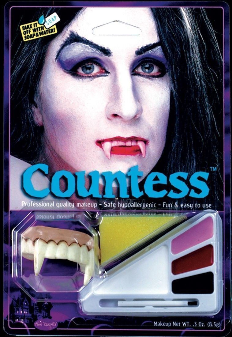 Набор для макияжа Вампирша прекрасно подойдет для таких праздников, как Хэллоуин и Пятница 13. В состав набора входит лоток с белой, розовой, бардовой и черной косметикой, кисточка, губка и мягкая вставная челюсть с острыми и белыми клыками. Грим легко смывается мыльной водой.