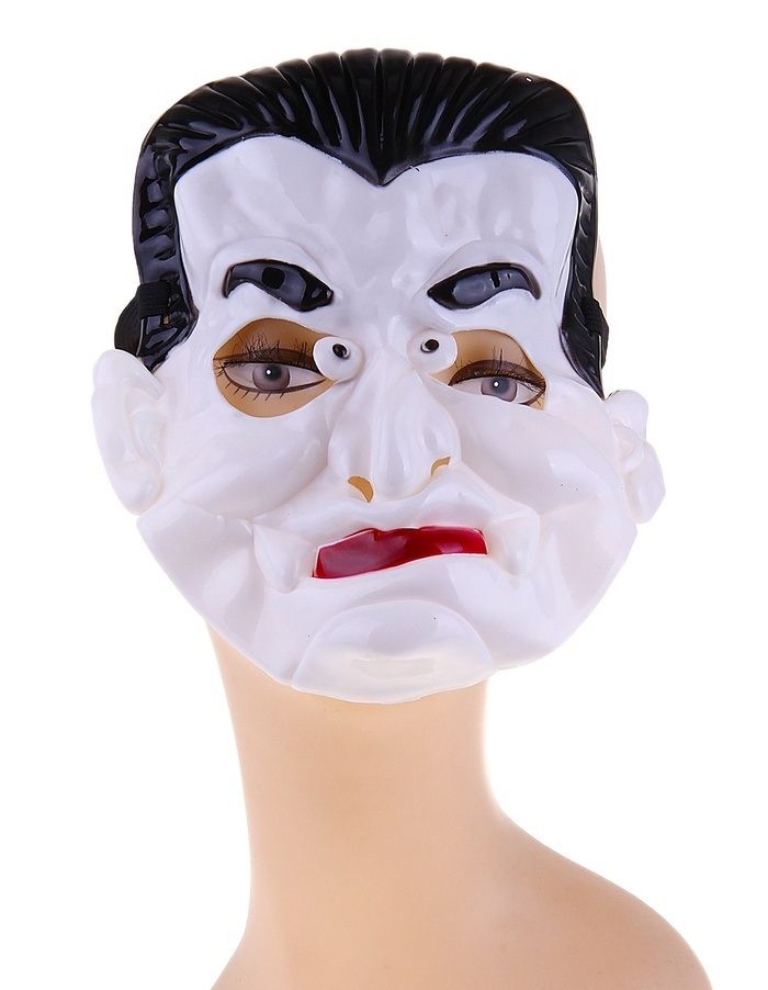 Маска вампира белого цвета с черными волосами и красными губами. Маска изготовлена из пластика и имеет размер 10х22 см.