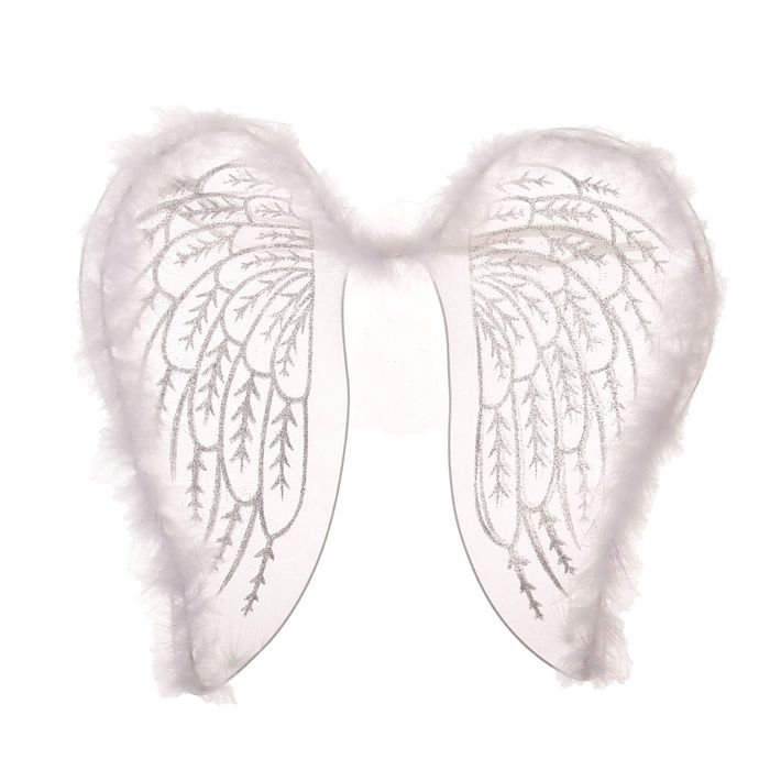 Белые крылья ангела с блестками помогут Вам создать образ светлого ангела на костюмированной вечеринке или утреннике. Крылья обильно украшены серебристыми блестками, которые образуют рисунок в виде перьев, и белой пушистой окантовкой по краям. Размер 36 × 32 см.