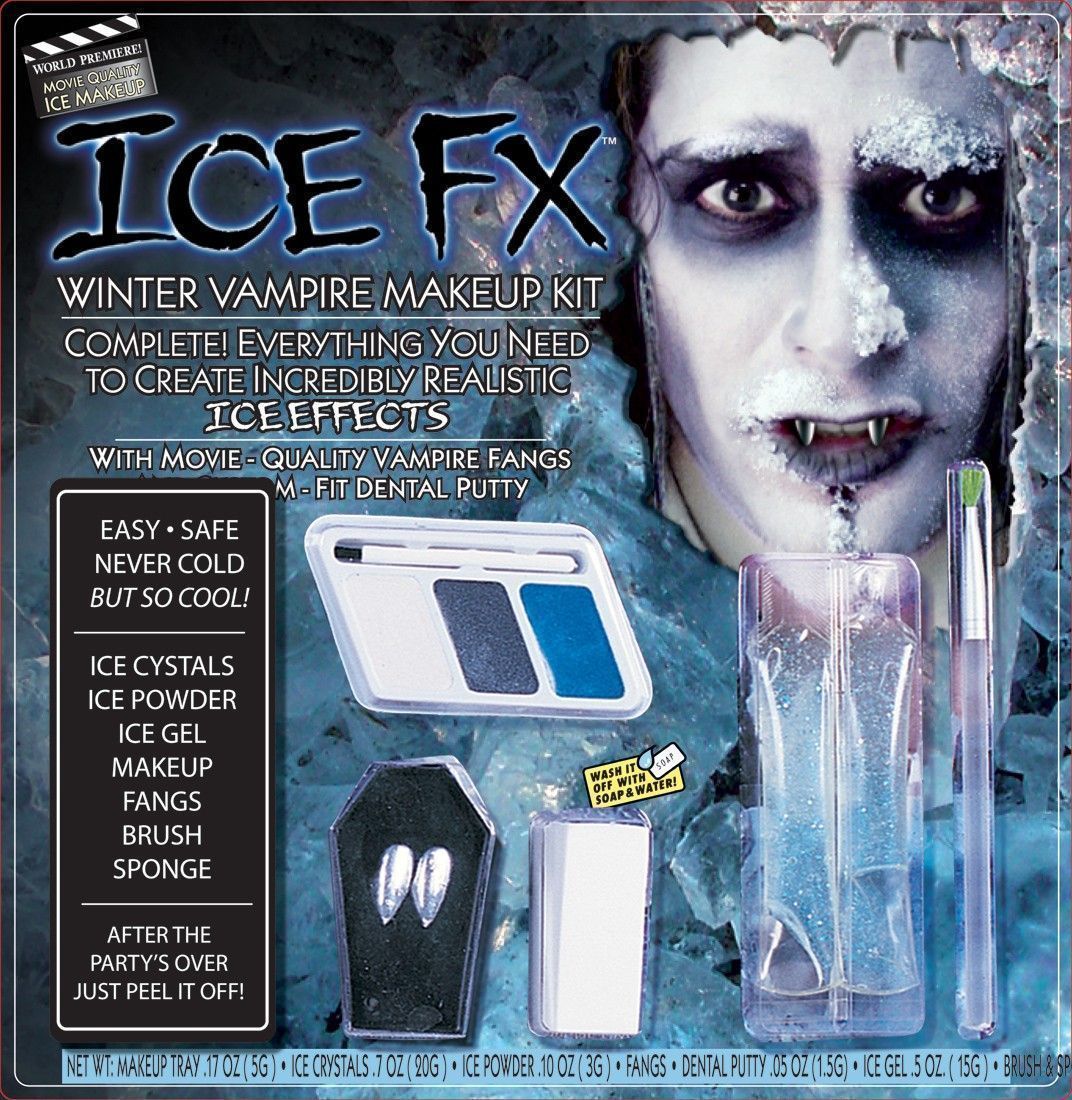 Макияж Замерзшего Вампира включает в себя накладные серебряные клыки, кисточку, губку, лоток с косметикой белого, серого и голубого цветов, а также ледяной порошок. Этот набор подойдет для Новогодних празднований и выступлений. С помощью него вы станете самым незабываемым зимним вампиром.
