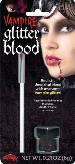 Вампирская блестящая кровь - это набор, в который входит искусственная блестящая кровь в баночке и кисточка для нанесения. В баночке 6 грамм.