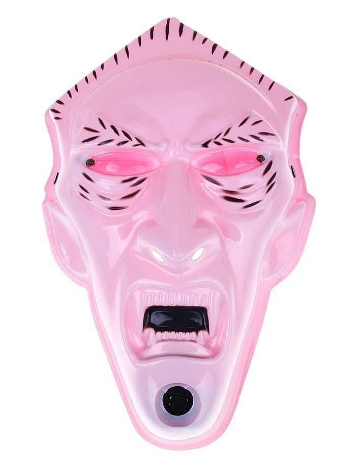 Маска вампира музыкальная розового цвета с горящими глазами. Маска изготовлена из пластика и имеет размер 20х33 см.