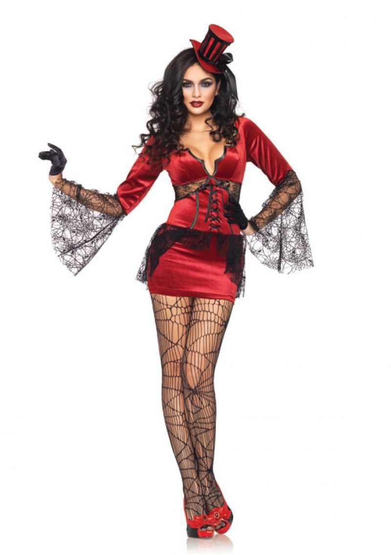 Бархатное платье вампирши - это короткое платье красного цвета с длинными рукавами, которые от локтя сделаны из черного полупрозрачного расклешенного материала. На груди имеется фигурный вырез. Спереди платье украшает черная вставка и шнуровка. Сзади от пояса отходит сетчатый черный материал.
