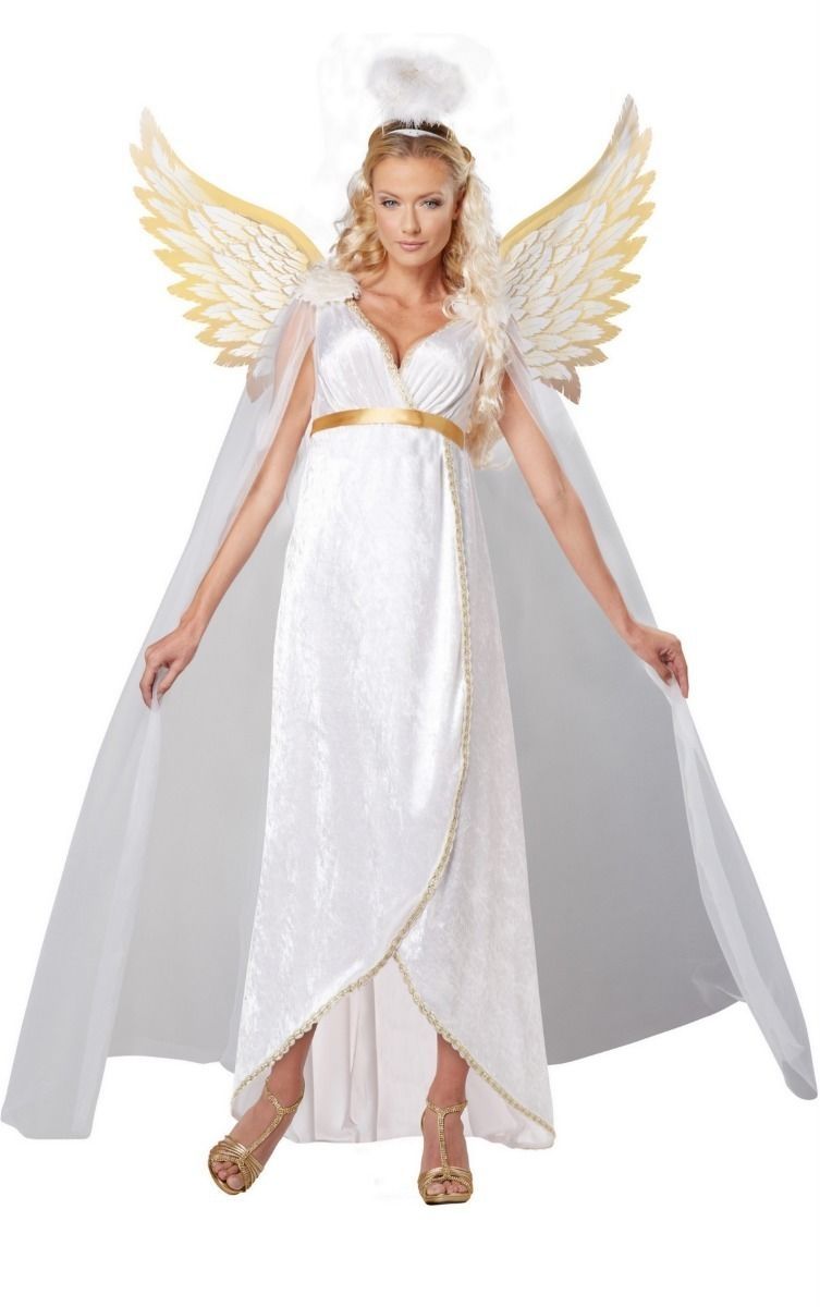 Костюм Рождественского Ангела-хранителя - это белоснежный костюм, который включает в себя длинное велюровое платье с золотистой отделкой и пришитой белой накидкой, большие крылья белого цвета с золотистой отделкой, а также пушистый нимб.