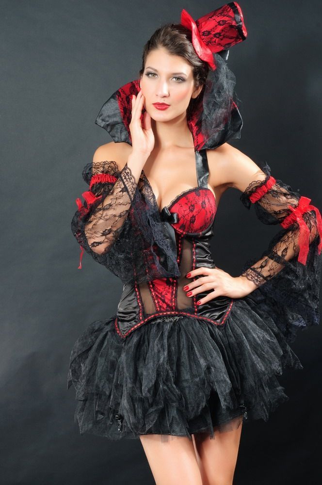 Костюм принцессы Хэллоуина выполнен в черно-красном цвете. В комплекте костюма имеется корсет с красным лифом и высоким воротником, пышная юбка, кружевная красная шляпка-цилиндр, а также отдельные кружевные рукава с красными рюшами и бантиками.