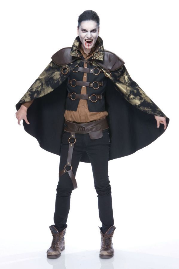 Костюм мрачного вампира включает в себя плащ с жилеткой с готическими металлическими кольцами и пояс. Добавив свой грим и прочие вампирские аксессуары, вы сделаете прекрасный образ вампира.