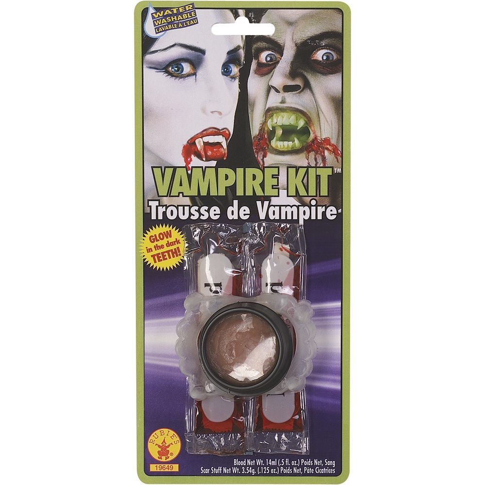 Комплект вампира включает в себя: 15 мл. поддельной крови, шрам, светящиеся в темноте клыки.
