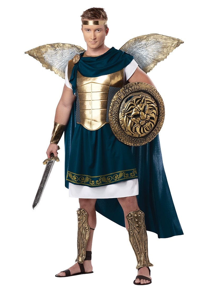 Костюм архангела Гавриила включает в себя сине-белую тунику до колен с золотистым узором на подоле, нагрудную броню с прикрепленным плащом, обруч на голову, блестящие крылья, нарукавники и броню на ноги.