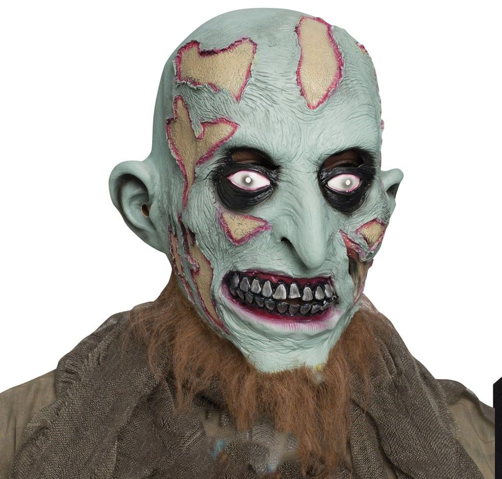 Голубая маска зомби с длинным носом, рваными ранами, прикреплённой рыжей бородой и жуткими зубами прекрасно подойдёт для таких праздников, как Хэллоуин, Пятница 13 и других жутких мероприятий.