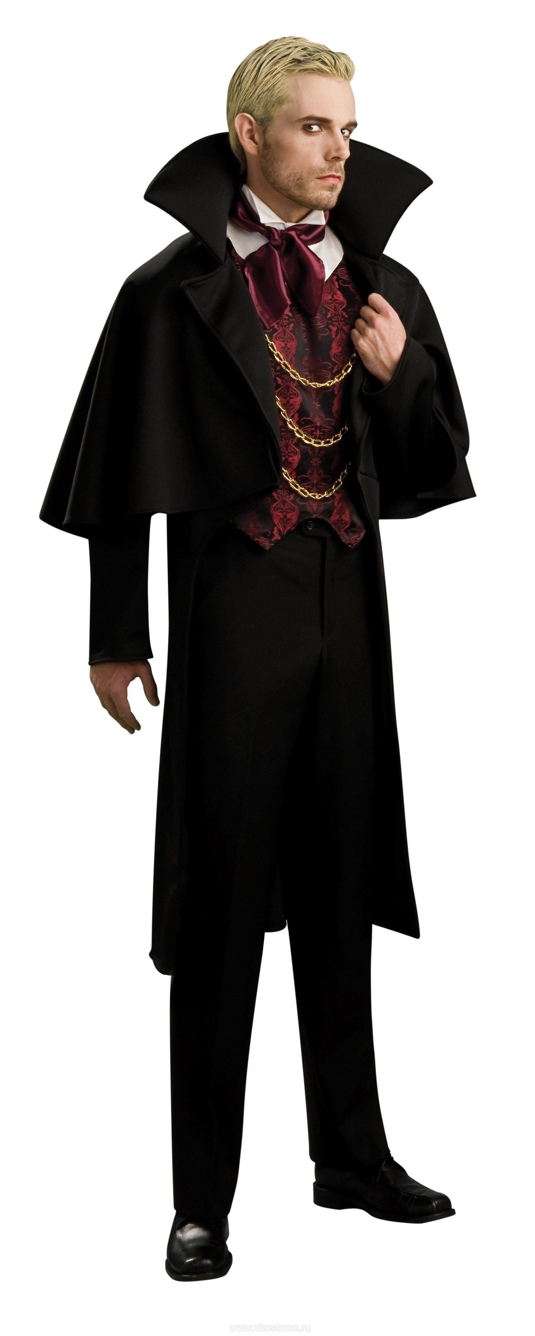 В костюм гламурного вампира входит: пальто с накидкой, рубашка со вшитым жилетом, шейный платок.