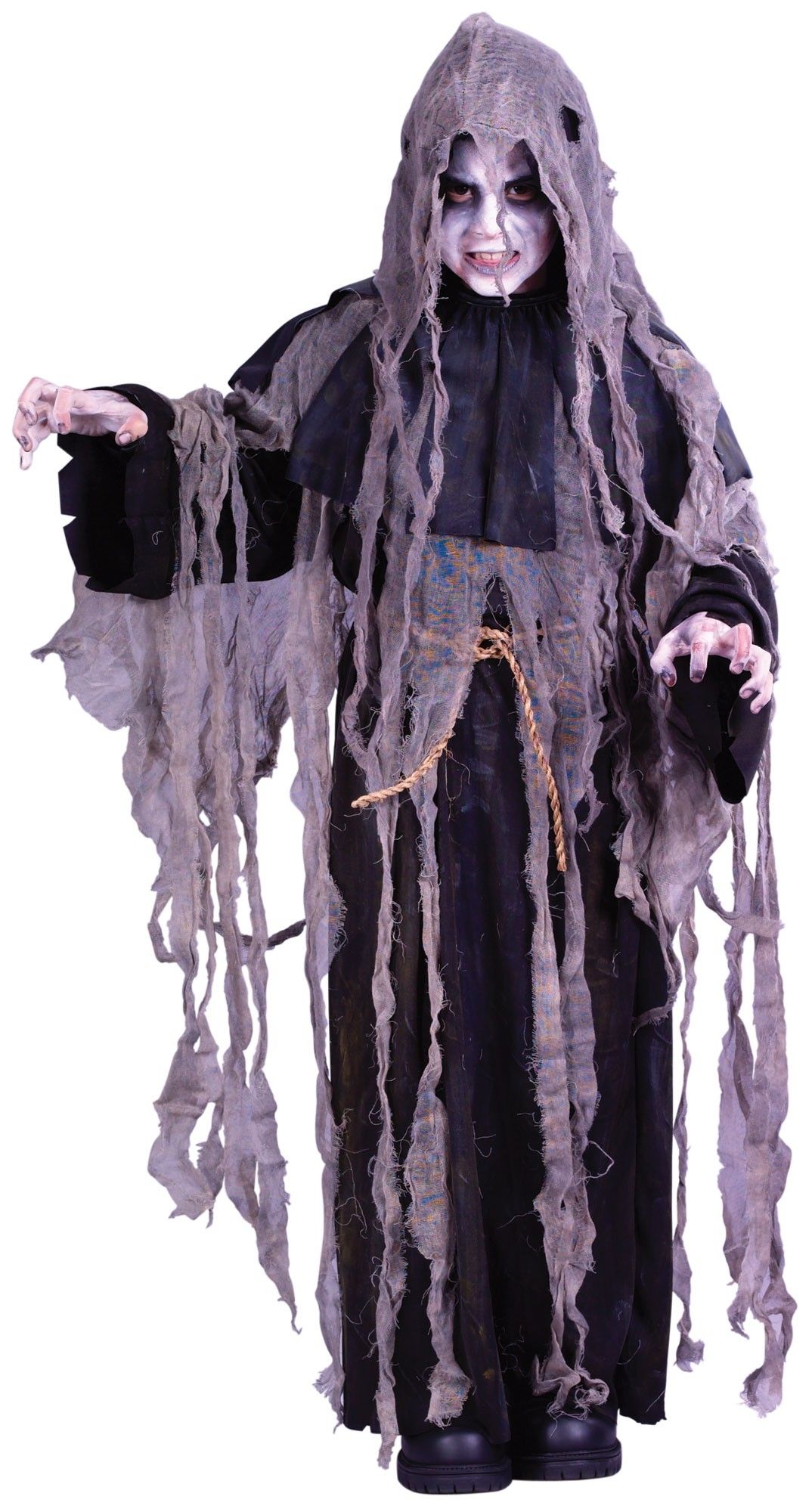Марлевый костюм зомби - это детский костюм, который включает в себя черное длинное одеяние с капюшоном, круглый воротник, веревку-ремень, а также рваную серую марлю, которая покрывает одеяние и придает ему жуткий вид.