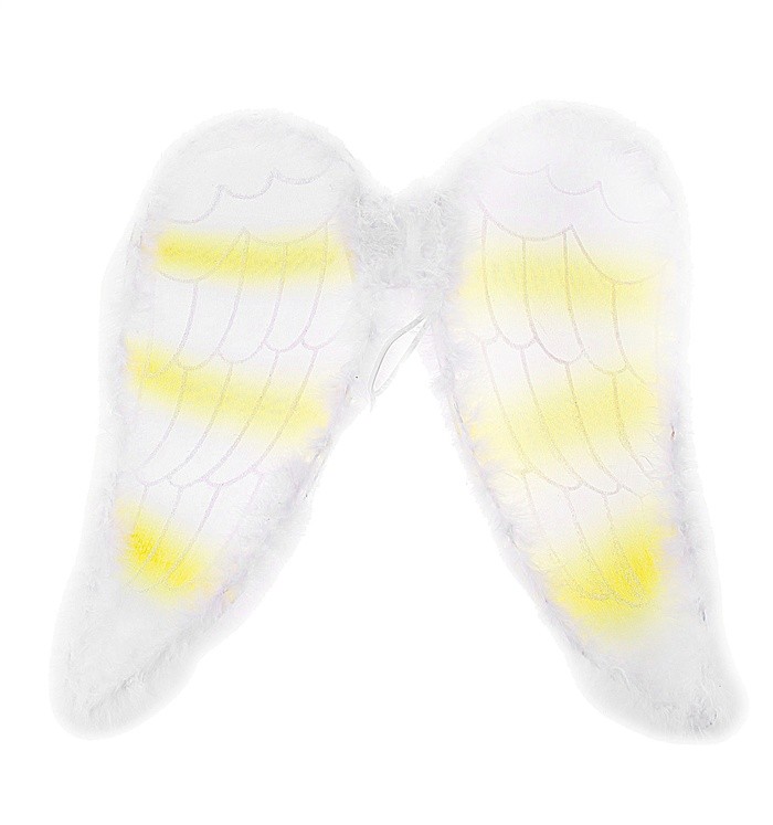 Бело-желтые ангельские крылья - необычные крылья с желтыми полосками, украшенные по краям белым пухом. Крылья крепятся с помощью специальных завязок.