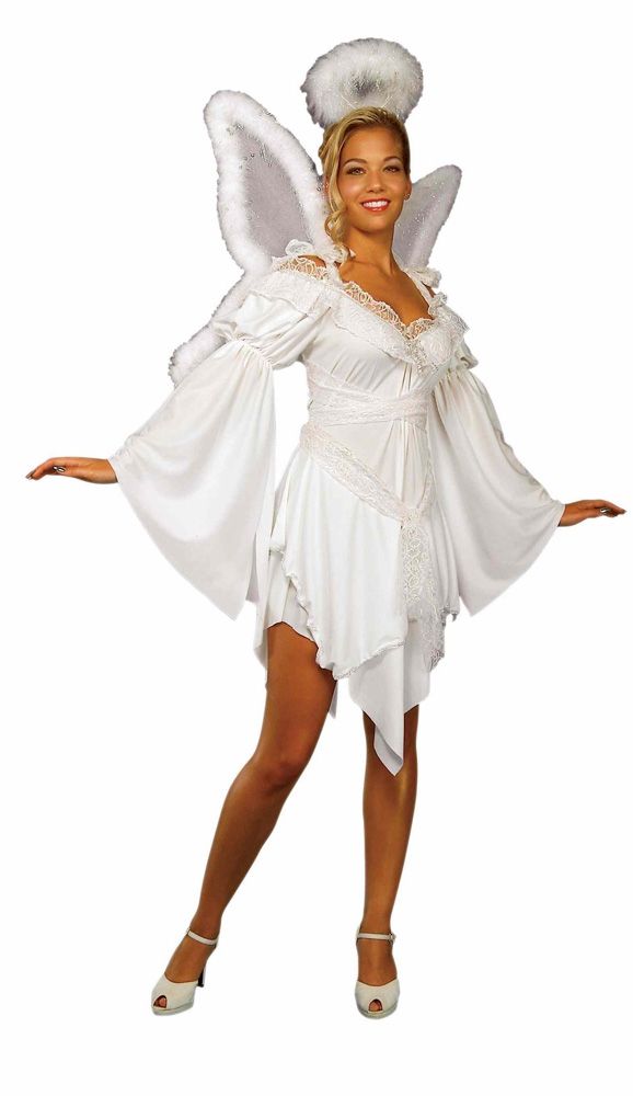 Костюм нежного ангелочка выполнен в белоснежном цвете. В костюм входит короткое платье с длинными широкими рукавами, платье украшено белыми изящными кружевами. В комплекте нимб, крылья не входят но их можно заказать отдельно.