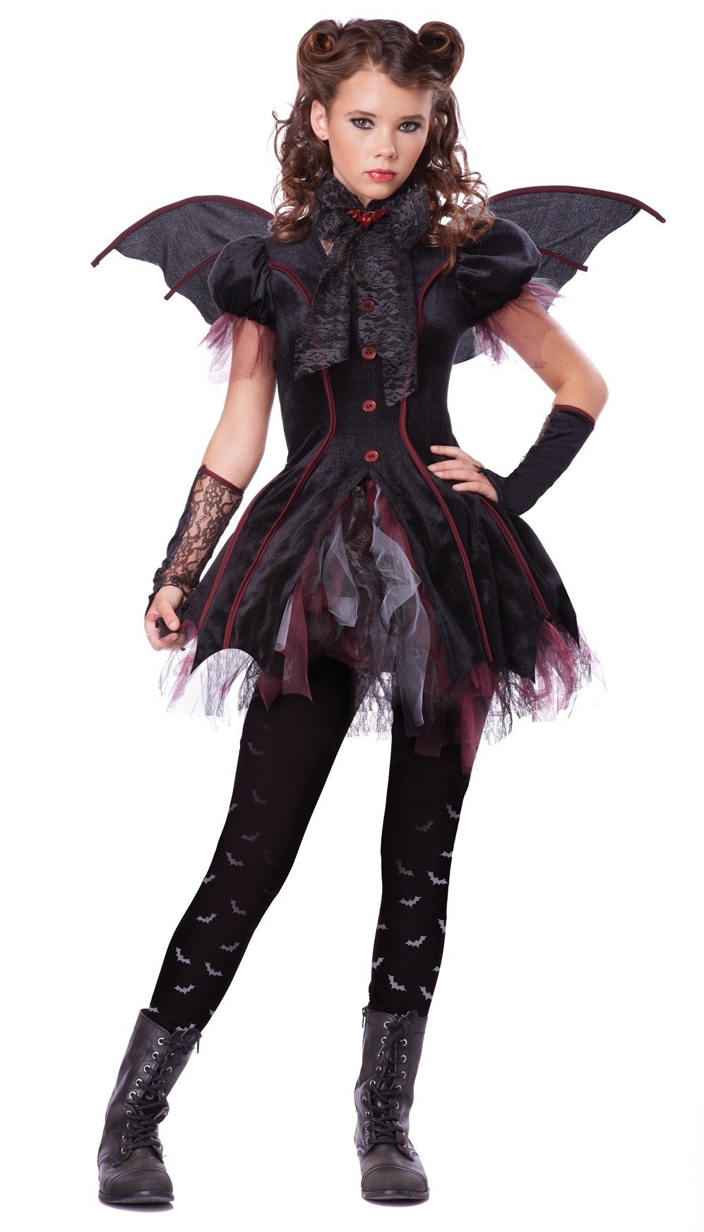 Подростковый костюм викторианской вампирши включает в себя короткое черное платье с красными вставками и рукавами-фонариками, пышную юбку-пачку, черные леггинсы с рисунком в виде летучих мышей, кружевные перчатки без пальцев, шарф и небольшие крылья.