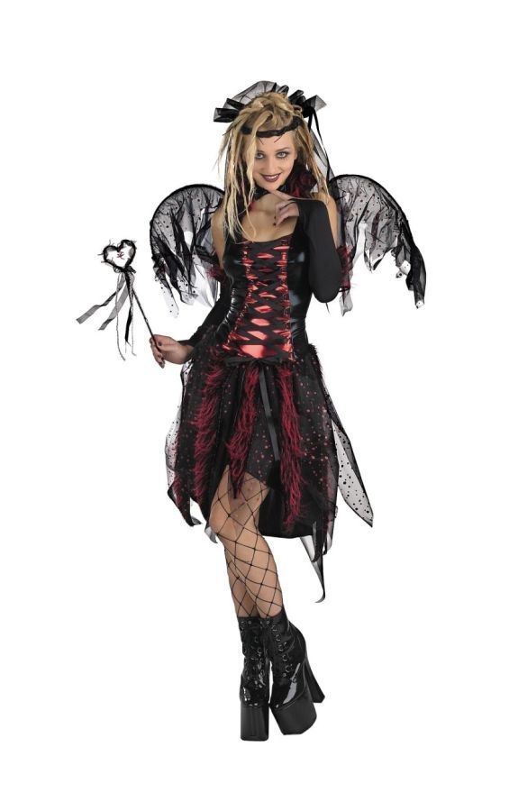 Костюм феи вампира выполнено в тёмных тонах. В комплект костюма входит платье со шнуровкой, крылья, перчатки и колье. К костюму можно подобрать различные аксессуары, которые дополнят ваш вампирский образ.
