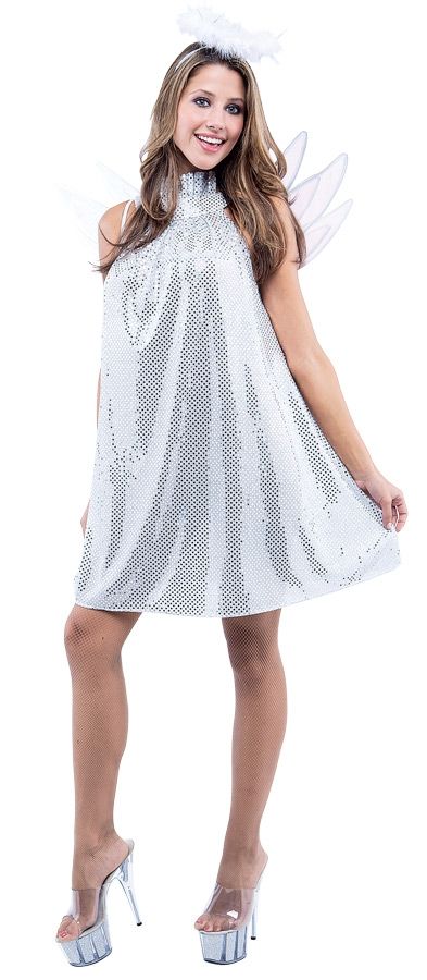 Трогательный и нежный костюм блестящего ангелочка для проведения рождественских утренников или в качестве наряда на корпоратив. В костюм входит короткое платье с блестками и высоким воротником, небольшие крылышки.