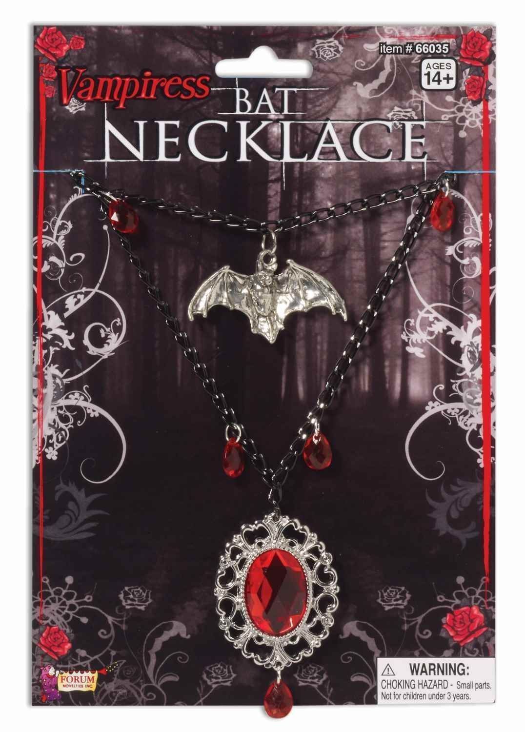 Вампирская подвеска на черной цепочке украшена красными камнями, а также маленькой летучей мышкой серебряного цвета.