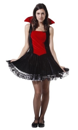 Платье очаровательной вампирши - короткое бархатное платье черного цвета с кружевной оборкой на юбке, с красной вставкой на груди и воротником стойкой.