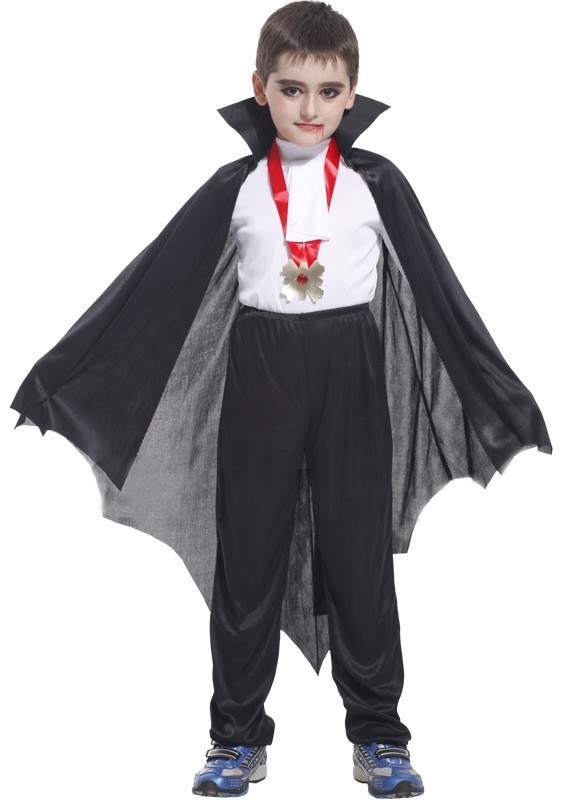 Детский костюм кровожадного Графа Дракулы перевоплотит Вашего ребенка в самого известного вампира. Костюм включает в себя черные брюки, белую рубашку, серо-черный плащ в форме крыльев летучей мыши и ожерелье.