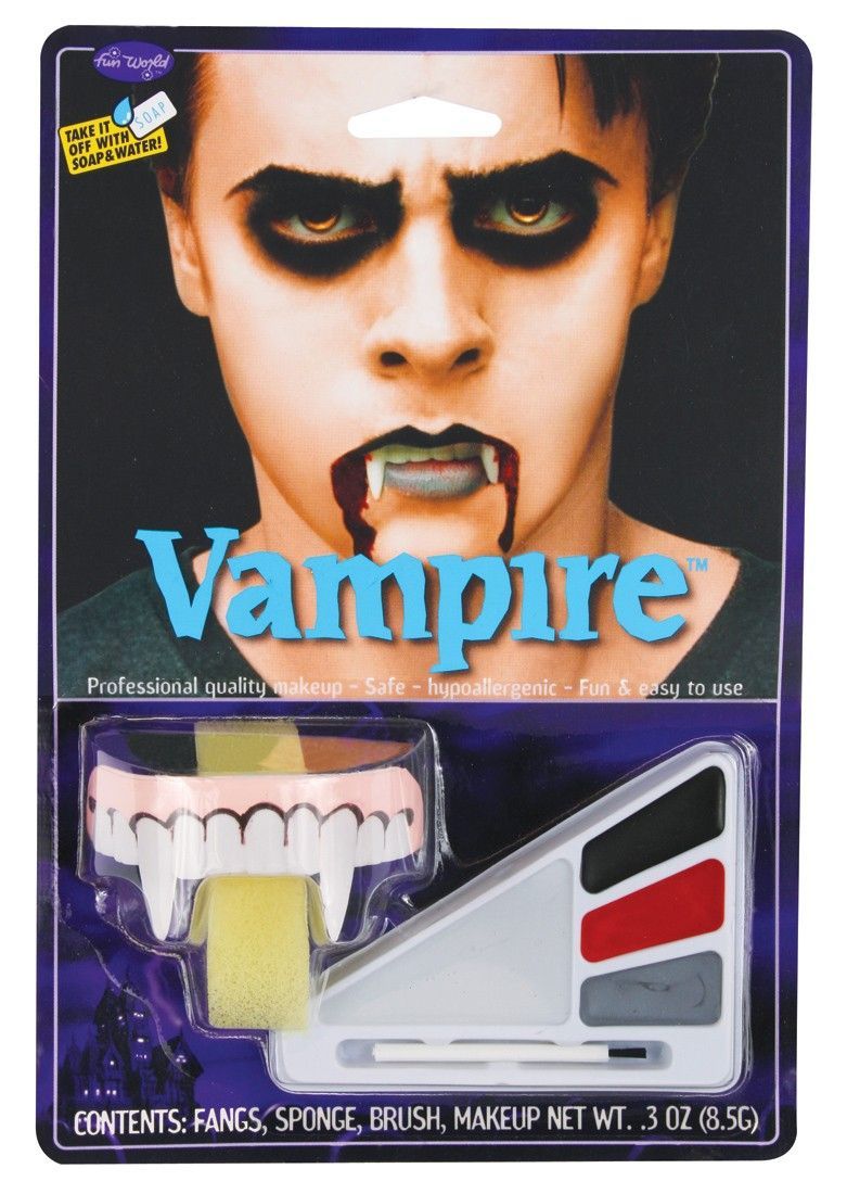 Набор для макияжа Вампир позволит вам превратить себя в настоящего кровожадного вампира. В набор входит лоток с косметикой четырех цветов: красного, серого, черного и белого, кисточка, губка и вставная мягкая челюсть с острыми клыками.